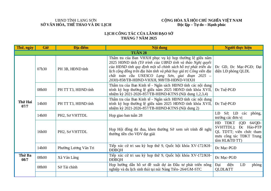 LỊCH CÔNG TÁC CỦA LÃNH ĐẠO SỞ TUẦN 28 NĂM 2025