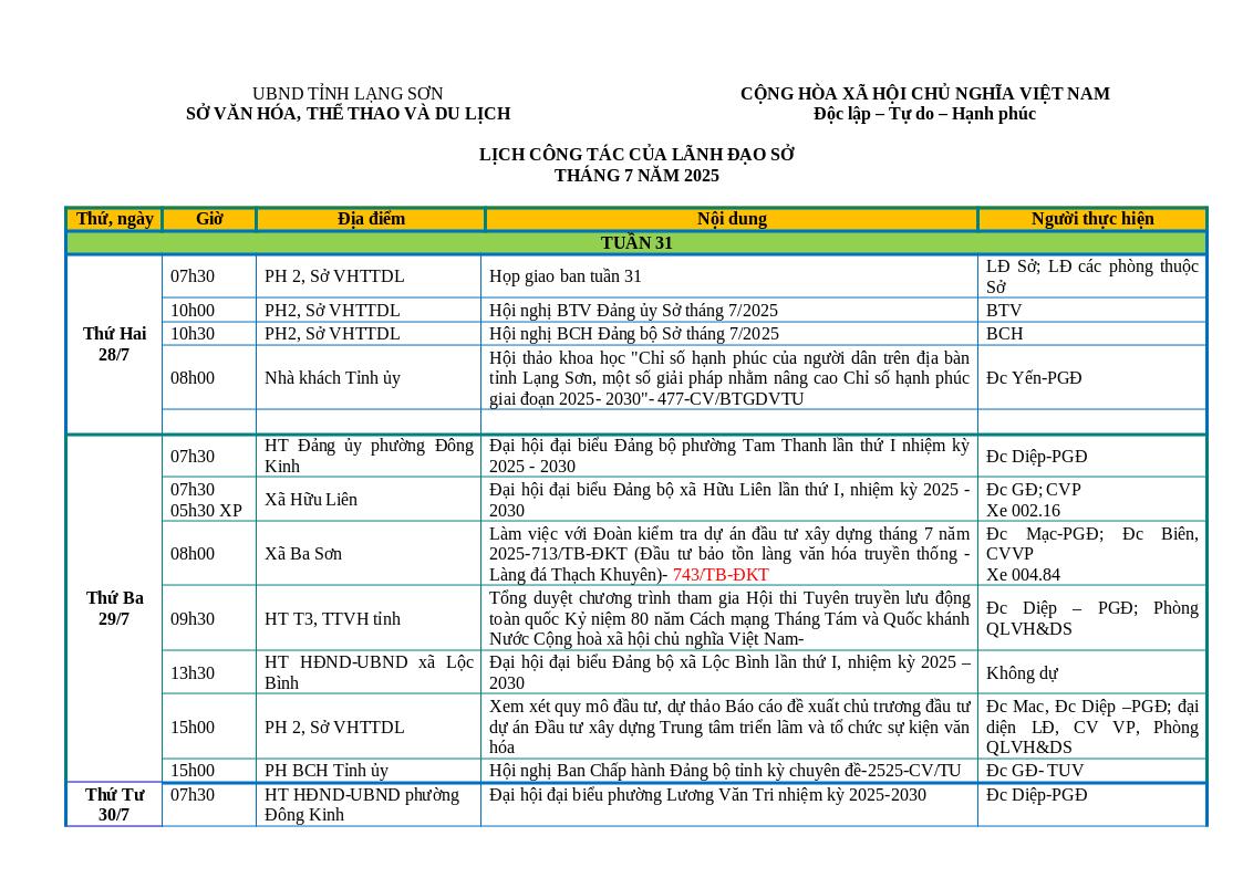 LỊCH CÔNG TÁC CỦA LÃNH ĐẠO SỞ TUẦN 31 NĂM 2025