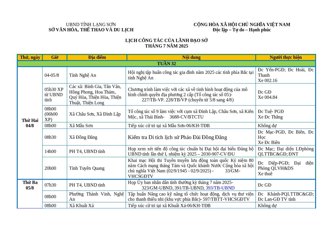 LỊCH CÔNG TÁC CỦA LÃNH ĐẠO SỞ TUẦN 32 NĂM 2025