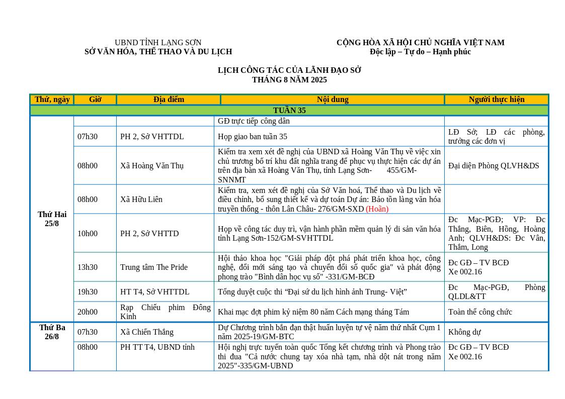 LỊCH CÔNG TÁC CỦA LÃNH ĐẠO SỞ TUẦN 35 NĂM 2025