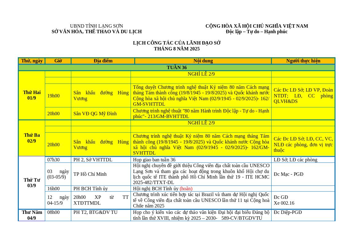 LỊCH CÔNG TÁC CỦA LÃNH ĐẠO SỞ TUẦN 36 NĂM 2025