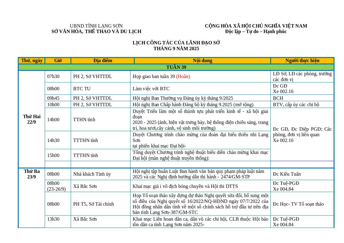 LỊCH CÔNG TÁC CỦA LÃNH ĐẠO SỞ TUẦN 39 NĂM 2025