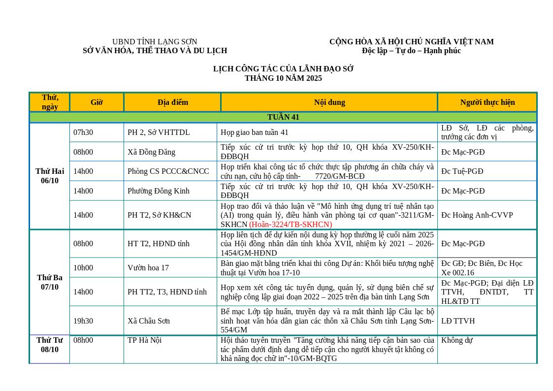 LỊCH CÔNG TÁC CỦA LÃNH ĐẠO SỞ TUẦN 41 NĂM 2025