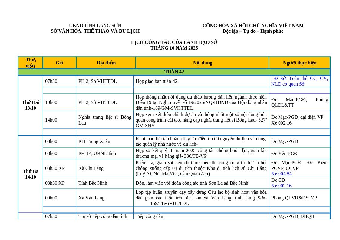LỊCH CÔNG TÁC CỦA LÃNH ĐẠO SỞ TUẦN 42 NĂM 2025