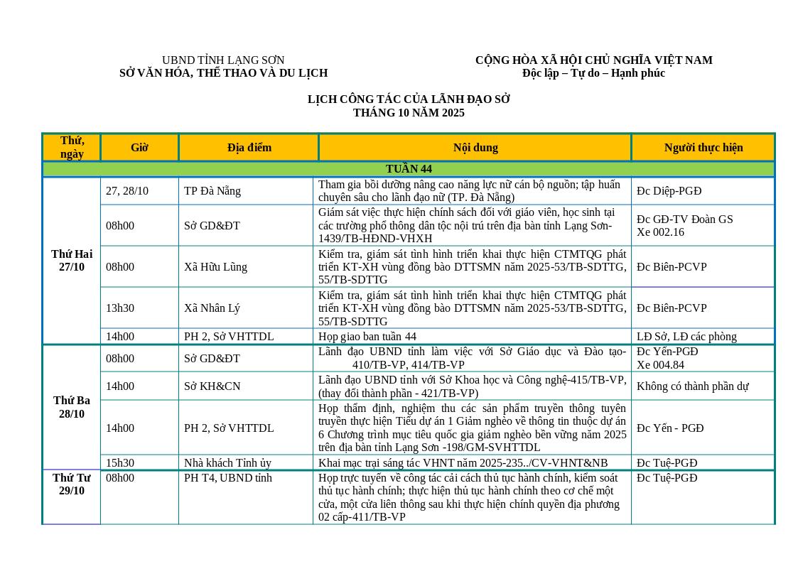LỊCH CÔNG TÁC CỦA LÃNH ĐẠO SỞ TUẦN 44 NĂM 2025