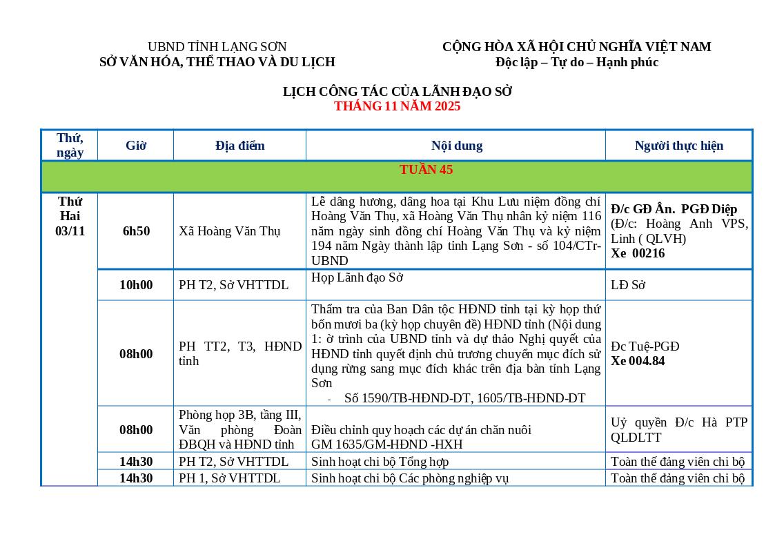 LỊCH CÔNG TÁC CỦA LÃNH ĐẠO SỞ TUẦN 45 NĂM 2025