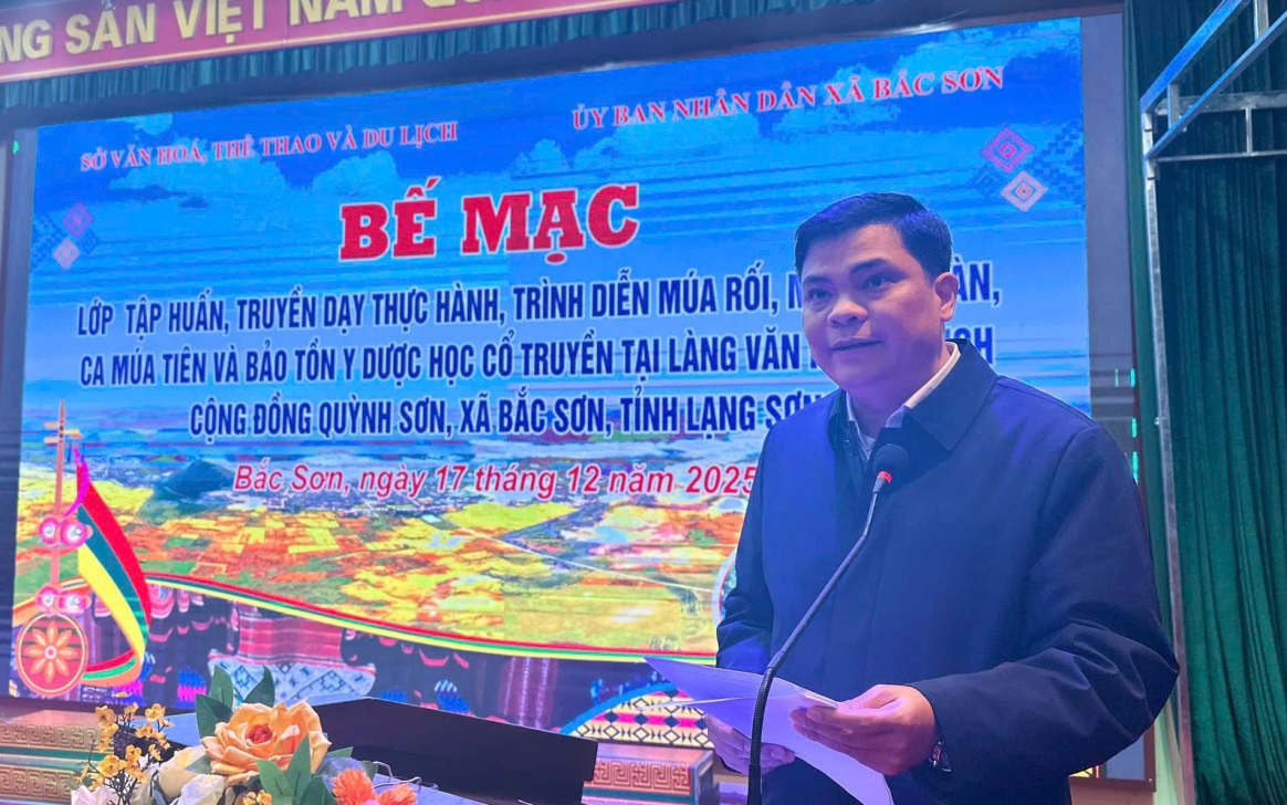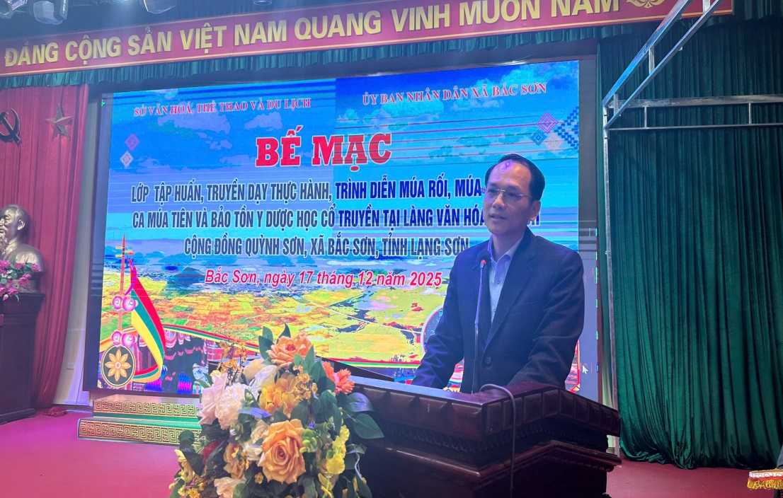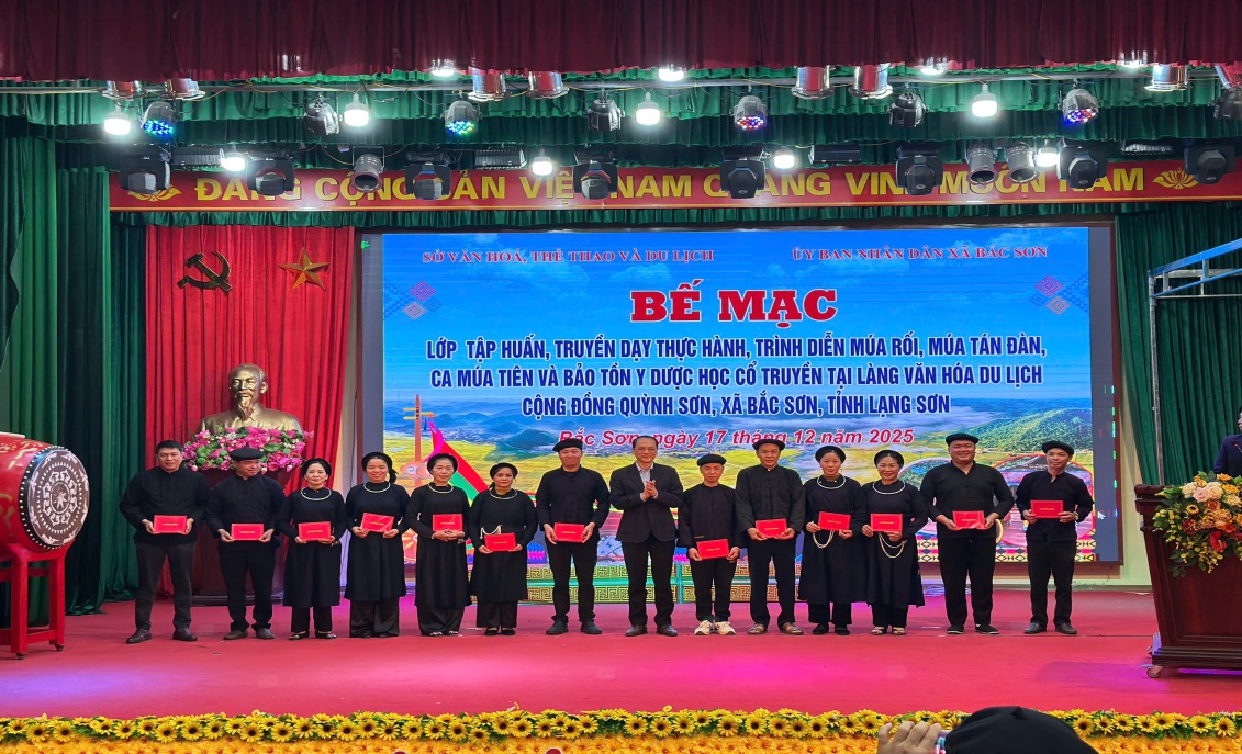 Ngày 17/12/2025, tại Làng văn hóa du lịch cộng đồng Quỳnh Sơn, Sở Văn hóa, Thể thao và Du lịch phối hợp với UBND xã Bắc Sơn tổ chức bế mạc lớp tập huấn, truyền dạy thực hành và trình diễn múa rối, múa tán tàn, ca múa tiên gắn với bảo tồn tri thức y dược học cổ truyền trong cộng đồng.