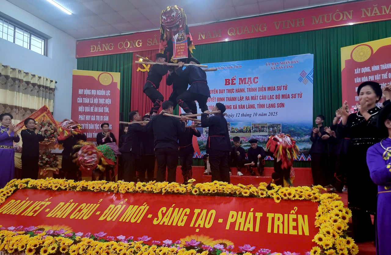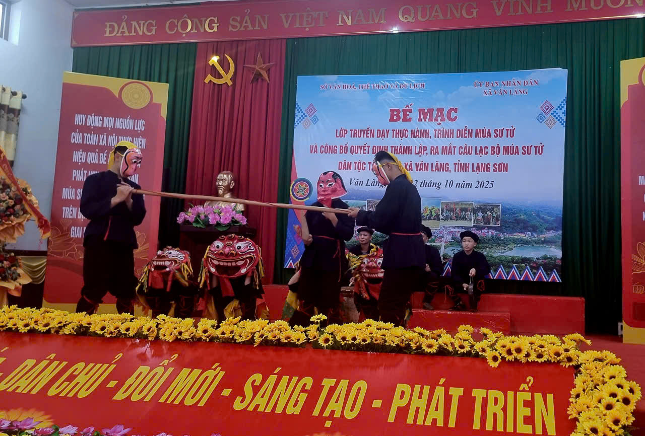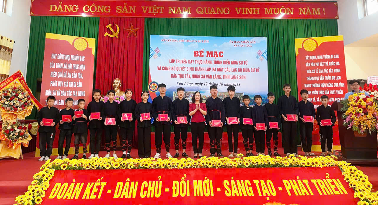 Ngày 12/10/2025, Sở Văn hoá, Thể thao và Du lịch (VHTTDL) tỉnh Lạng Sơn phối hợp với Ủy ban nhân dân (UBND) xã Văn Lãng tổ chức bế mạc lớp truyền dạy thực hành, trình diễn múa sư tử và công bố Quyết định thành lập, ra mắt câu lạc bộ (CLB) múa sư tử dân tộc Tày, Nùng xã Văn Lãng, tỉnh Lạng Sơn.