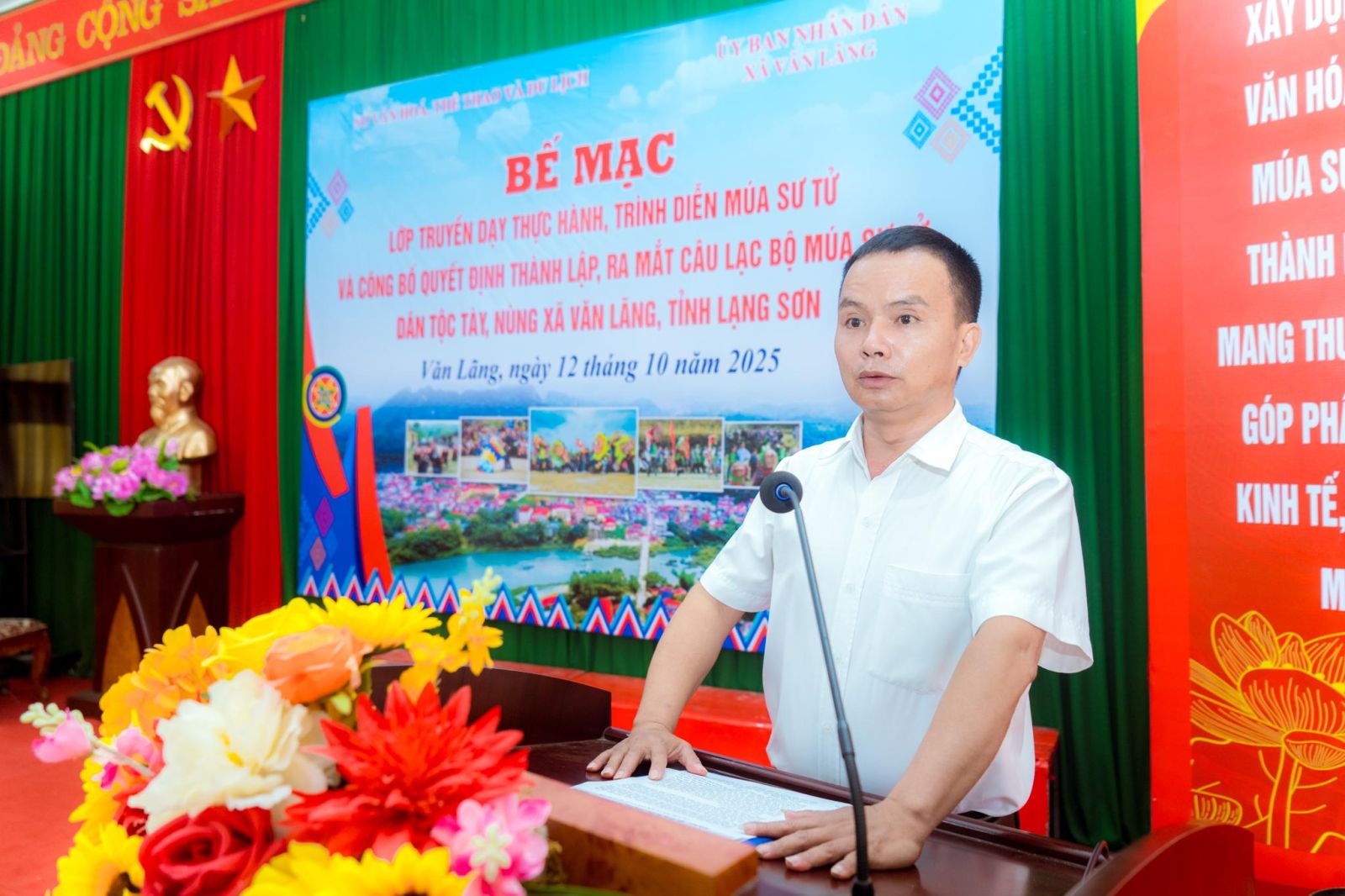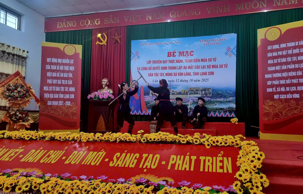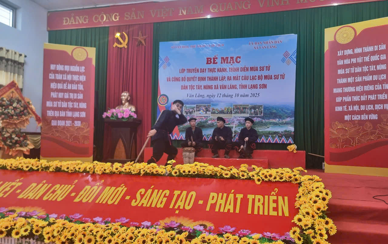 Ngày 12/10/2025, Sở Văn hoá, Thể thao và Du lịch (VHTTDL) tỉnh Lạng Sơn phối hợp với Ủy ban nhân dân (UBND) xã Văn Lãng tổ chức bế mạc lớp truyền dạy thực hành, trình diễn múa sư tử và công bố Quyết định thành lập, ra mắt câu lạc bộ (CLB) múa sư tử dân tộc Tày, Nùng xã Văn Lãng, tỉnh Lạng Sơn.