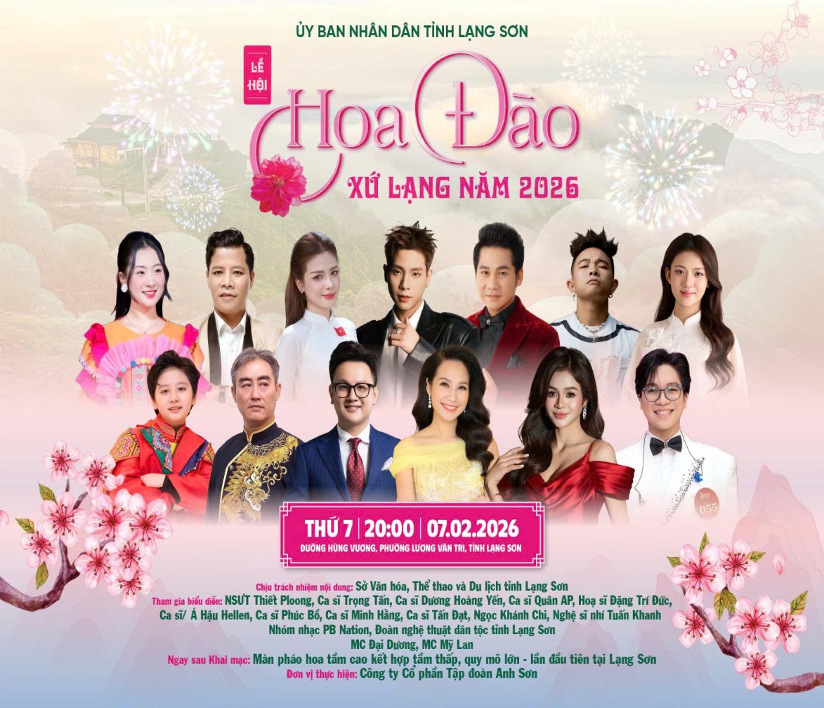 Tối 7/2/2026, tại sân khấu đường Hùng Vương (phường Lương Văn Tri, TP Lạng Sơn), UBND tỉnh Lạng Sơn tổ chức Chương trình Khai mạc Lễ hội Hoa Đào Xứ Lạng và các hoạt động mừng Đảng, mừng Xuân Bính Ngọ năm 2026, mở đầu cho chuỗi sự kiện văn hóa – du lịch đặc sắc của tỉnh trong dịp đầu xuân mới.