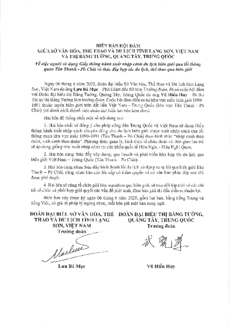 Tiêu đề văn bản | Biên bản hội đàm giữa Sở VHTTDL Lạng Sơn và Chính quyền nhân dân thị Bằng Tường (Trung Quốc) về việc sử dụng giấy thông hành xuất nhập cảnh du lịch biên giới qua lối thông quan Tân Thanh - Pò Chài và thúc đẩy hợp tác du lịch, thể thao qua biên giới | ||