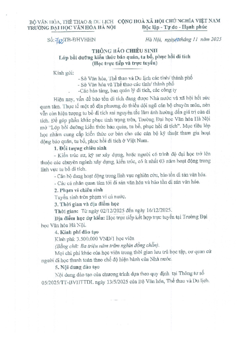 | Tiêu đề văn bản | THÔNG BÁO CHIÊU SINH lớp bồi dưỡng kiến thức tu bổ, bảo quản, phục hồi di tích | ||