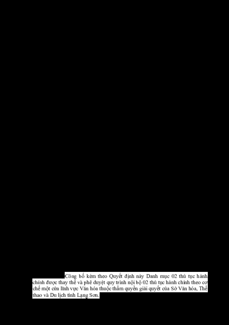 | Tiêu đề văn bản | Quyết định Về việc công bố Danh mục thủ tục hành chính được thay thế và phê duyệt quy trình nội bộ trong giải quyết thủ tục hành chính theo cơ chế một cửa trong lĩnh vực Văn hoá thuộc thẩm quyền giải quyết của Sở Văn hóa, Thể thao và Du lịch tỉnh Lạng Sơn | ||