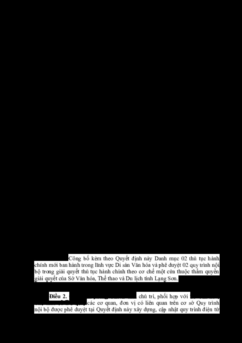 | Tiêu đề văn bản | Quyết định Về việc công bố Danh mục thủ tục hành chính mới ban hành trong lĩnh vực Di sản Văn hóa và phê duyệt quy trình nội bộ trong giải quyết thủ tục hành chính theo cơ chế một cửa thuộc thẩm quyền giải quyết của Sở Văn hóa, Thể thao và Du lịch, tỉnh Lạng Sơn | ||