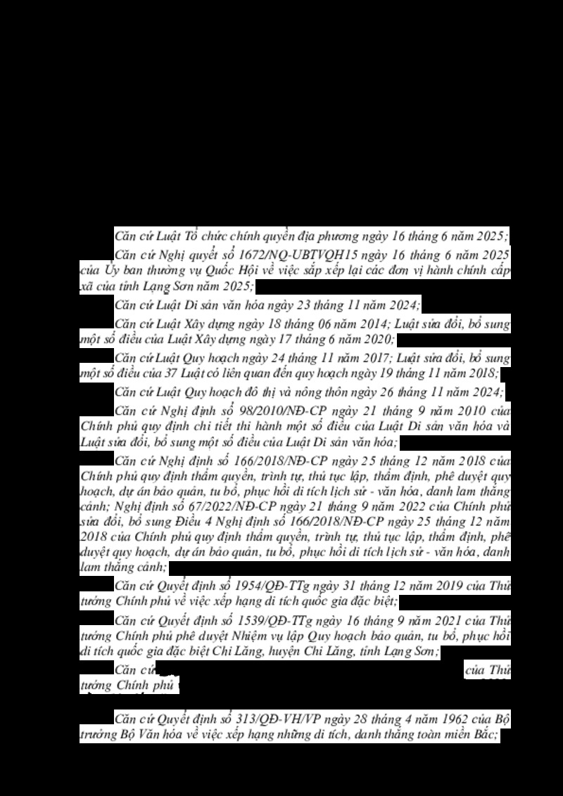 | Tiêu đề văn bản | Quyết định Phê duyệt Quy hoạch bảo quản, tu bổ, phục hồi và phát huy giá trị 22 điểm di tích quốc gia khu di tích Chi Lăng, tỉnh Lạng Sơn | ||