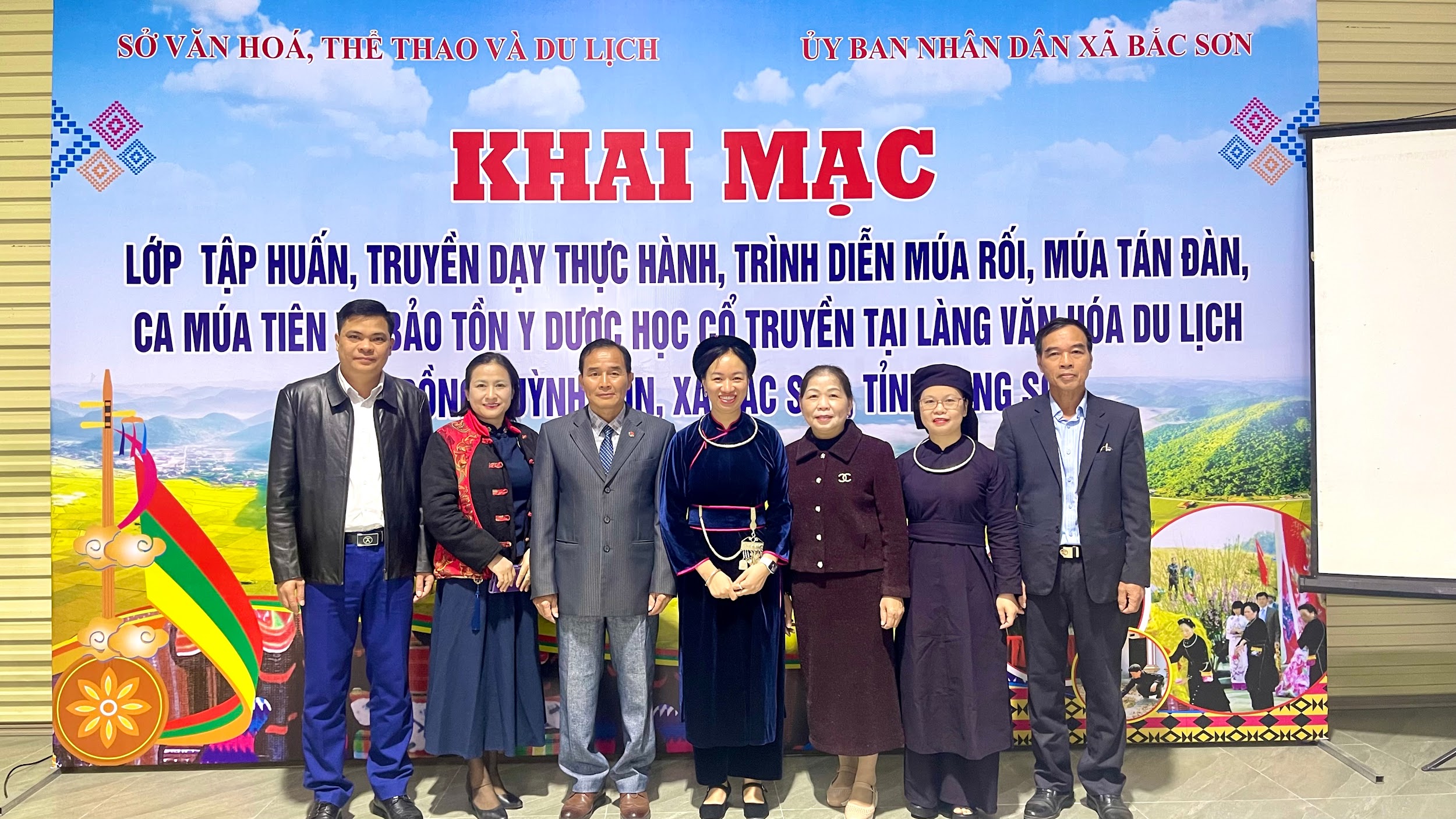 Tham dự chương trình khai mạc có đồng chí Nông Bích Diệp, Phó Giám đốc Sở Văn hóa, Thể thao và Du lịch, đồng chí Phương Anh Tư, Phó Chủ tịch UBND xã Bắc Sơn, các giảng viên, báo cáo viên lớp tập huấn, nghệ nhân và các học viên các lớp truyền dạy thuộc các loại hình văn hóa phi vật thể: múa rối, múa tán đàn, ca múa tiên, y dược học cổ truyền.