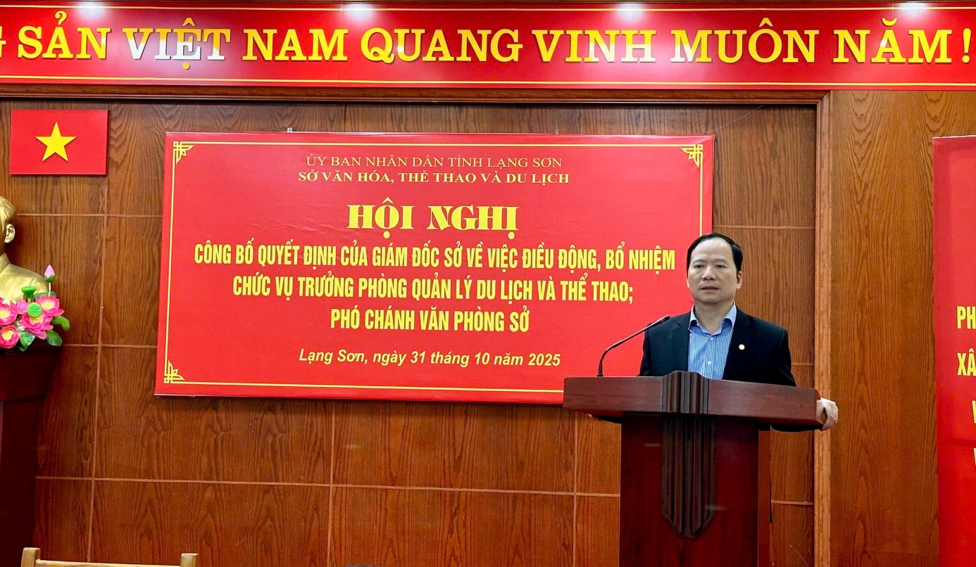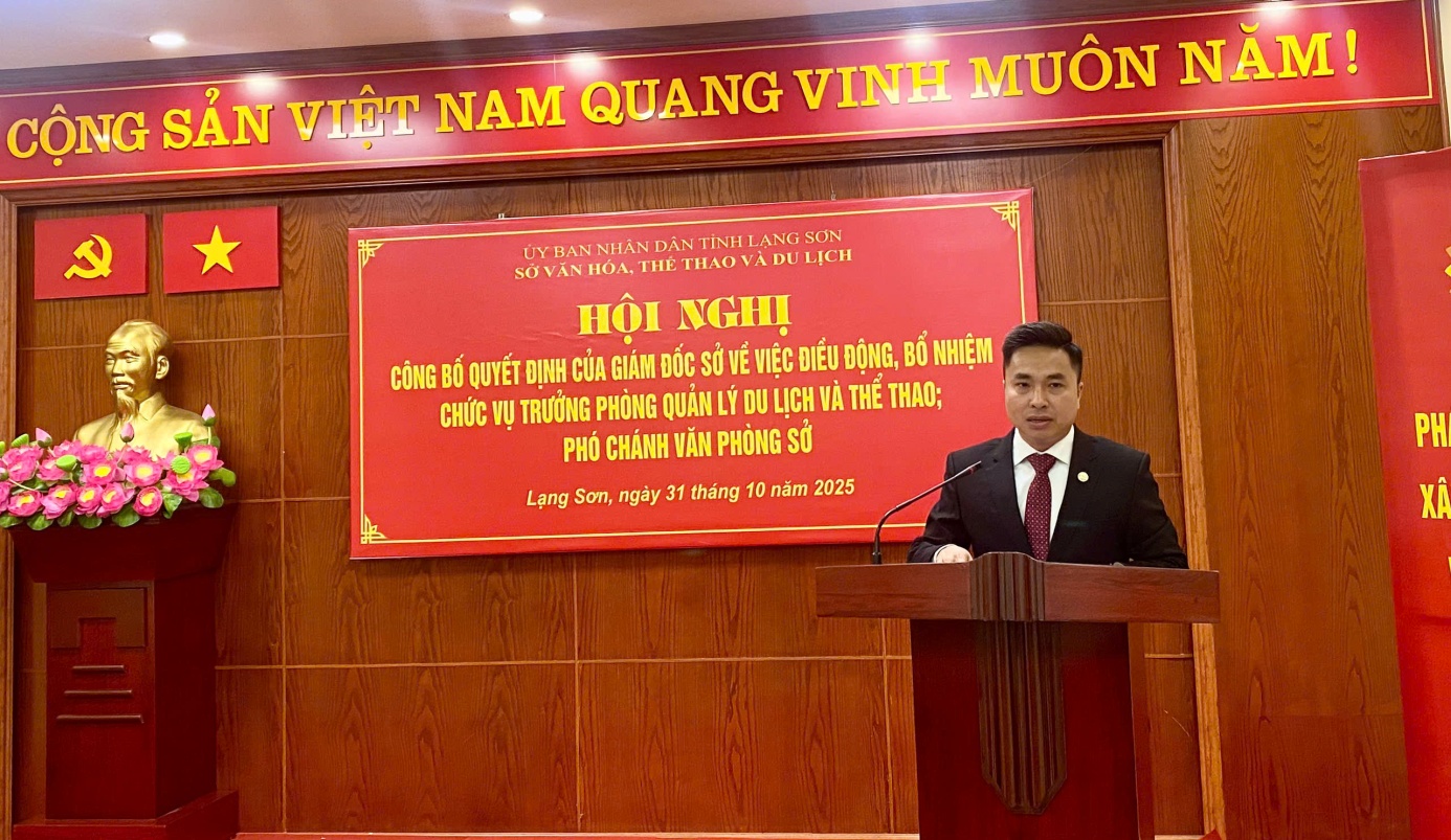Tại Hội nghị, đồng chí Liễu Thu Hồng, Phó Chánh Văn phòng đã công bố Quyết định số 756/QĐ-SVHTTDL ngày 30/10/2025 của Giám đốc Sở Văn hóa, Thể thao và Du lịch tỉnh Lạng Sơn về việc điều động, bổ nhiệm đồng chí Vi Anh Thắng, Chánh Văn phòng giữ chức vụ Trưởng phòng Quản lý Du lịch và Thể thao; Quyết định số 758/QĐ-SVHTTDL ngày 30/10/2025 của Giám đốc Sở Văn hóa, Thể thao và Du lịch tỉnh Lạng Sơn về việc điều động, bổ nhiệm đồng chí Lương Trọng Hảo, Phó Trưởng phòng Quản lý Du lịch và Thể thao giữ chức vụ Phó Chánh Văn phòng. Các quyết định có hiệu lực từ ngày 01/11/2025.